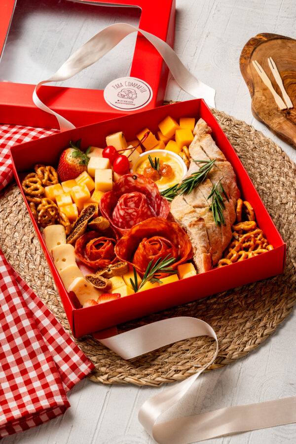 La cajita incluye chorizo español, salami y pepperoni, 5 tipos de quesos, frutas de temporada, 1 dip, pan artesanal y acompañamientos. Incluye moño y tarjeta (Los quesos o ingredientes que se encuentren agotados a la hora de ejecutar la elaboración de las Tablas de Queso, serán reemplazados por productos de igual categoría sin que se altere la calidad de la misma)